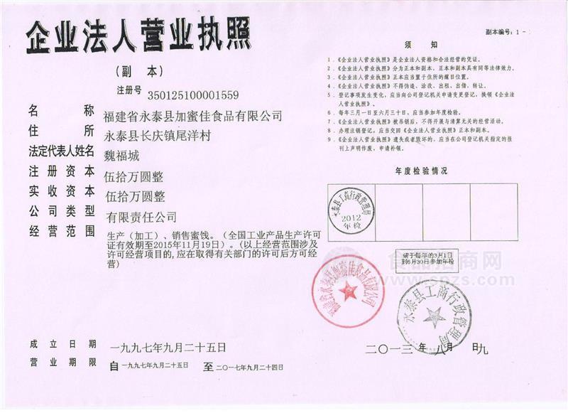福州新加蜜佳食品有限公司与福建省永泰县加蜜佳食品有限公司是同属于加蜜佳企业的,加蜜佳是一个集产、供、销与一体的综合型农副产品生产型企业,总公司创建于1997年。坐落在李果之乡美誉的永泰县长庆镇,尾洋工业区。占地面积20000平方米,企业总投资2000多万元。